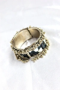 Framed with intricate antique-finish metalwork and delicate bead detailing, this bracelet exudes a vintage charm that pairs effortlessly with both modern and bohemian styles. Its open-ended design ensures a comfortable, customizable fit for most wrist sizes.