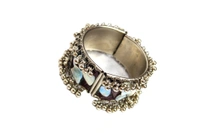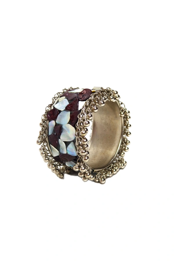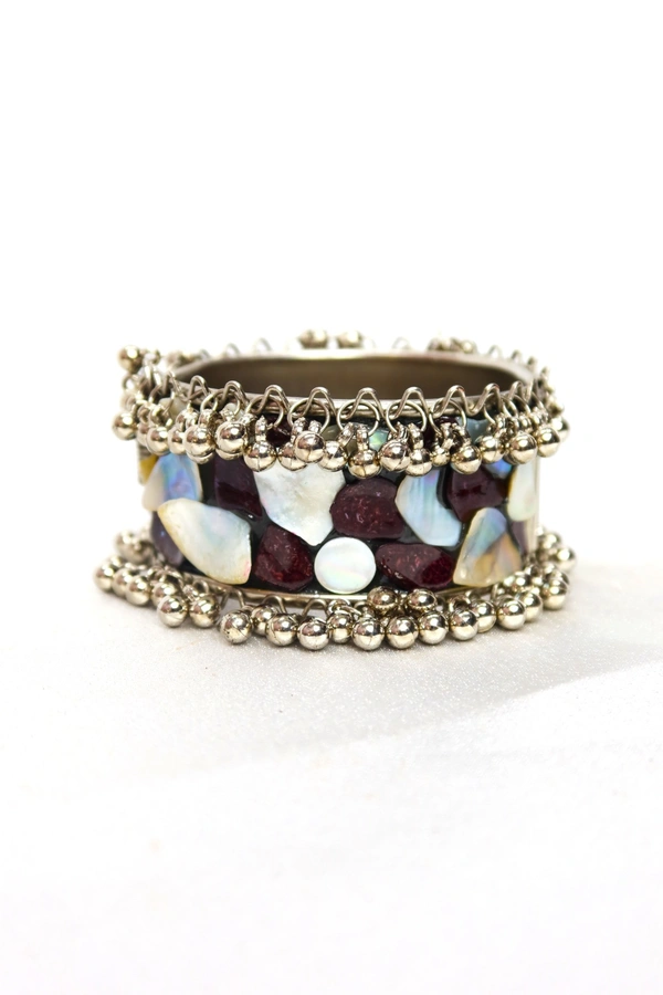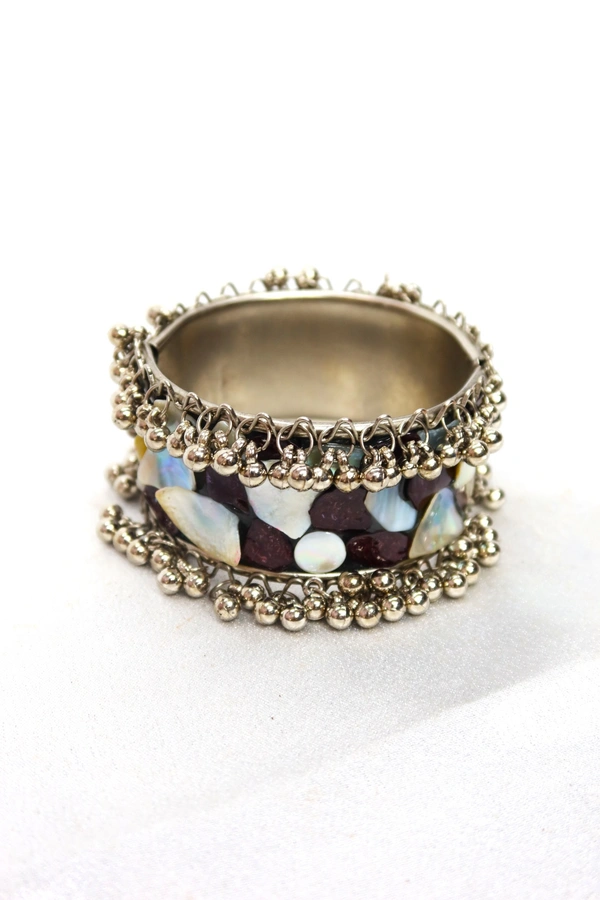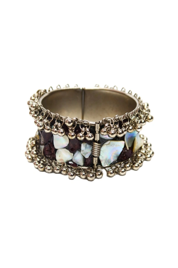Framed with intricate antique-finish metalwork and delicate bead detailing, this bracelet exudes a vintage charm that pairs effortlessly with both modern and bohemian styles. Its open-ended design ensures a comfortable, customizable fit for most wrist sizes.
