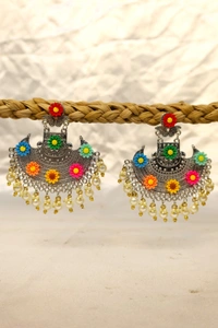 Add A Touch Of Bohemian Flair To Your Look With These Oxidised Jhumka Jhumki Earrings, Crafted For Style, Comfort, And Versatility. Perfect For College Wear, Festive Occasions, Parties, Or As A Charming Gift, These Earrings Feature Intricate Tribal-Inspired Detailing And A Lightweight Design. The Antique Silver Finish Gives Them A Rustic Elegance That Pairs Well With Both Ethnic And Western Outfits. A Must-Have Accessory For Fashion-Forward Women And Girls Who Love Bold, Statement Jewellery With A Cultural Twist.