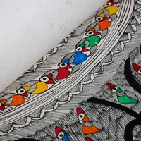 Elevate your living space with this exquisite Palak Saxena Madhubani painting. Handcrafted with precision, it features a captivating depiction of colorful fishes swimming amidst flourishing trees, all rendered in the traditional Madhubani style. The intricate detailing and vibrant hues add a touch of elegance and charm to any room. Measuring 32.2 x 24.2 inches, this unframed masterpiece is a perfect addition to your art collectio