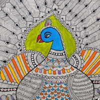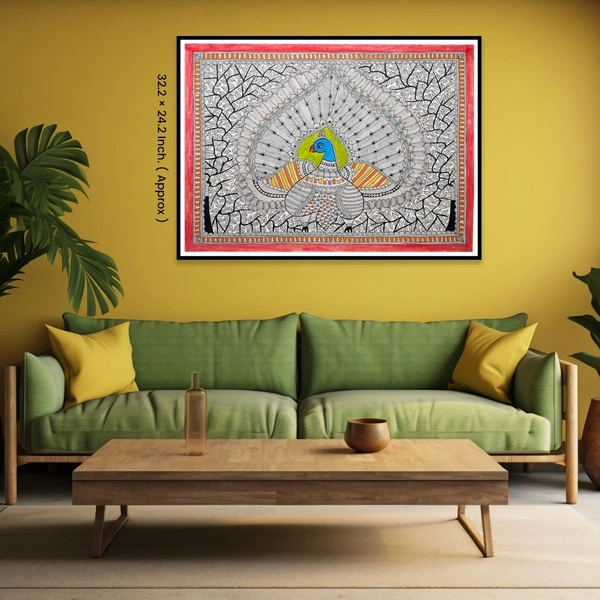 Step into a world of enchantment with Palak Saxena's Madhubani painting, showcasing the mesmerizing dance of a peacock. Crafted with intricate details and vibrant colors, this unframed masterpiece captures the essence of traditional Madhubani artistry. The graceful movements of the peacock are brought to life, adding a touch of elegance and sophistication to any space. Perfect for the art connoisseur or as a unique gift, this painting is sure to be a captivating addition to your home or office décor.