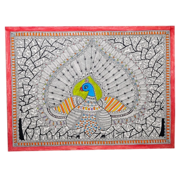 Graceful Peacock Dance: Authentic Madhubani Painting | Unframed