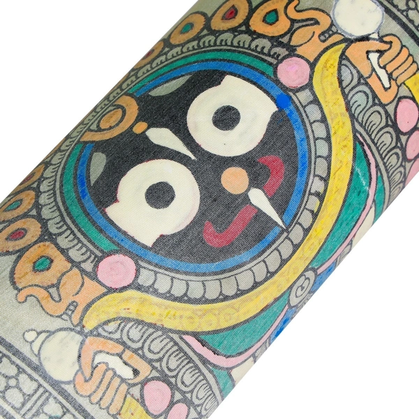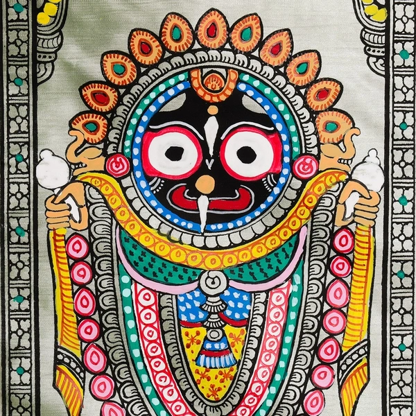 Lord Jagannath Pattachitra is painting. Worshipped as the Lord of the Universe, Lord Jagannath is an ethereal form of Lord Vishnu's avatar, Shri Krishan. The painting Auspicious Pattachitra was made by an authentic artist from Orissa .Pattachitra paintings on Tussar silk are a beautiful and traditional art form from the state of Orissa in India. Pattachitra is a style of painting known for its intricate details and vibrant colors, often depicting mythological themes or scenes from daily life. When these paintings are done on Tussar silk, it adds a unique and luxurious touch to the artwork due to the rich texture and sheen of the silk fabric.