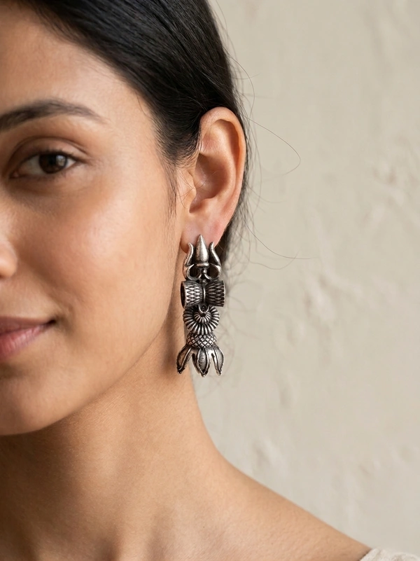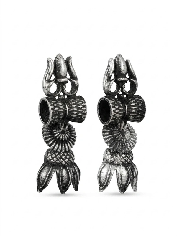 Enhance Your Ethnic Style With These Beautifully Designed Oxidised German Silver Trishool Earrings. Inspired By Traditional Tribal Artistry, These Earrings Feature A Unique Trishool Pattern Combined With Intricate Detailing That Gives Them A Bold And Elegant Look. The Antique Oxidised Finish Adds A Vintage Charm, Making Them A Perfect Accessory For Both Modern And Traditional Outfits. Crafted With Care Using High-Quality Material, These Earrings Are Lightweight, Durable, And Comfortable For All-Day Wear. Whether You Are Dressing Up For A Festive Celebration, Wedding, Or Casual Outing, These Earrings Will Add A Graceful Touch To Your Overall Appearance. Pair Them With Sarees, Kurtis, Or Indo-Western Attire To Create A Stylish Statement. These Earrings Also Make A Thoughtful Gift For Your Loved Ones On Special Occasions