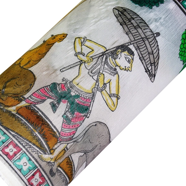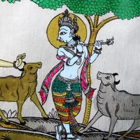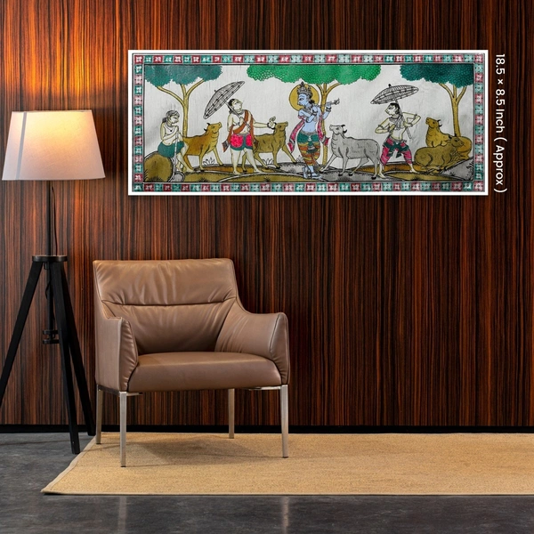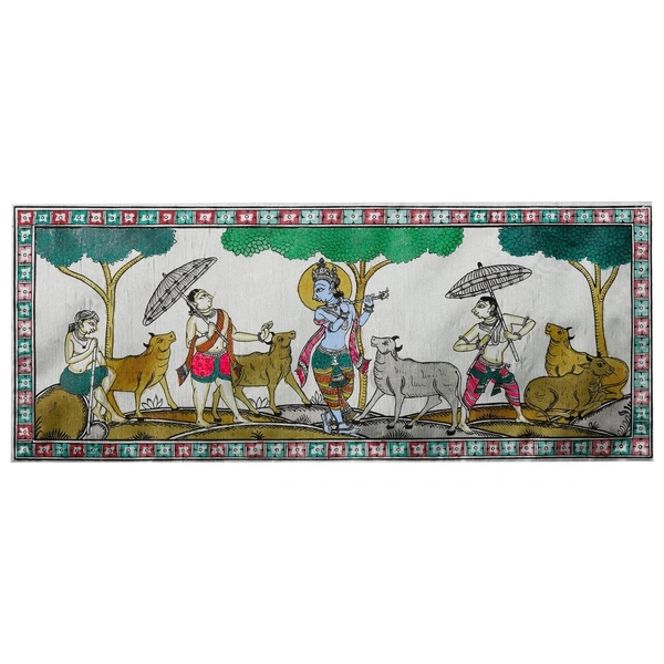 This exquisite Pattachitra painting portrays a beautiful scene of Lord Krishna enchanting his cows and friends with the mesmerizing music of his flute. The vibrant colors and intricate detailing bring to life the joyous atmosphere, capturing the essence of Krishna's divine charm and the blissful harmony of nature.