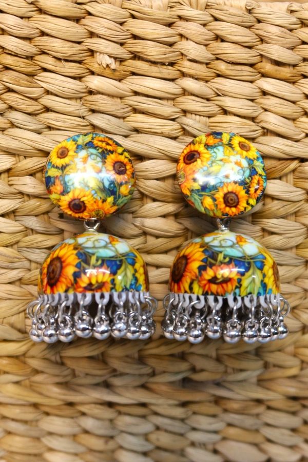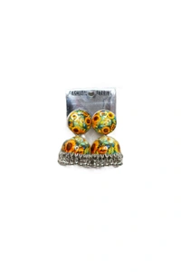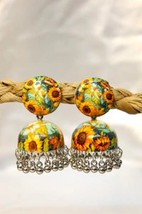 Bring a burst of sunshine to your jewellery collection with these exquisite Meenakari Jhumki earrings. These stunning pieces feature a vibrant sunflower pattern meticulously crafted on both the stud and dome portions, showcasing the intricate art of Meenakari work. The upper portion consists of a beautifully decorated round stud, while the lower jhumki (bell-shaped) component is adorned with delicate silver-toned pearl beads that create a graceful jingling effect with movement. The earrings perfectly blend traditional craftsmanship with contemporary style, making them versatile enough for both festive occasions and daily wear. The cheerful yellow and green colour palette, combined with the detailed floral artwork, makes these earrings a standout accessory that complements both traditional Indian attire and modern fusion wear. Each piece is carefully designed to be lightweight and comfortable for extended wear, while the secure fastening ensures they stay perfectly in place.