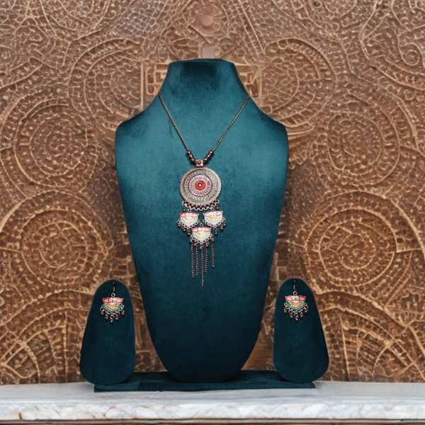 | Description | Elevate your look with this exquisite traditional oxidized silver necklace set, designed to add elegance and charm to any outfit. Featuring intricate detailing and a vintage oxidized finish, this jewellery set is perfect for festive occasions, weddings, parties, and everyday ethnic wear. Pair it with sarees, lehengas, or Indo-western outfits to make a stunning style statement. Step into timeless elegance with this stunning oxidized silver necklace set – a must-have for every jewellery lover! |