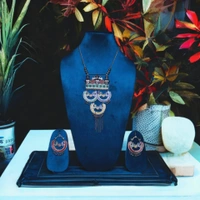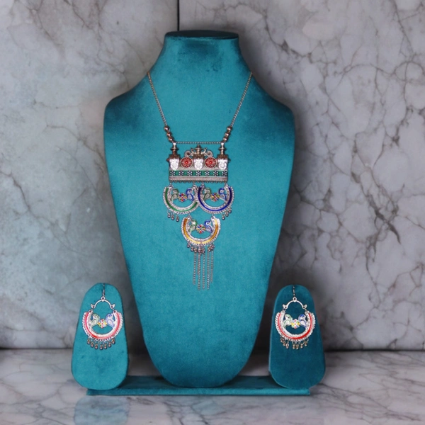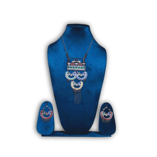 DescriptionElevate your look with this exquisite traditional oxidized silver necklace set, designed to add elegance and charm to any outfit. Featuring intricate detailing and a vintage oxidized finish, this jewellery set is perfect for festive occasions, weddings, parties, and everyday ethnic wear. Pair it with sarees, lehengas, or Indo-western outfits to make a stunning style statement. Step into timeless elegance with this stunning oxidized silver necklace set – a must-have for every jewellery lover!
